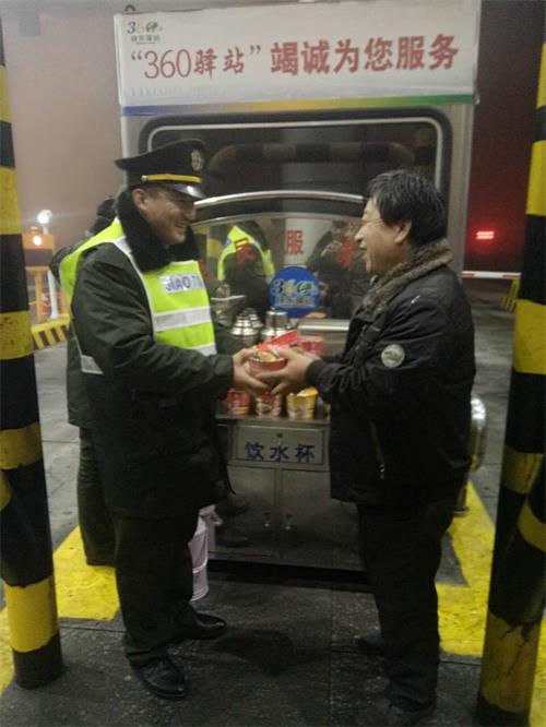 2017年1月5日,因大霧封閉等原因,很多司乘人員及車輛滯留在收費站廣場附近,景州主線站的值班領導在了解到這些滯留的司乘人員大多已經在高速上呆了兩三天時間,早已饑腸轆轆,口干舌燥。看著廣場上瑟瑟發抖又饑渴難耐的司乘們,景州主線站的值班站長張運達和副站長龐向陽立即組織站內員工,為焦急等待的司乘人員送上方便面和熱水,并盡最大能力為他們提供幫助,積極開展360快樂驛站便民服務工作,溫暖了廣大司乘的心房,滯留的司乘人員對收費站職工的熱心服務紛紛豎起了大拇指。