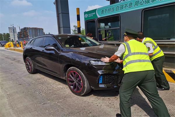 9月2日,一輛黑色轎車領卡時前機蓋冒出白煙,工作人員第一時間給予幫助,將車一步步推出車道靠邊停下,隨后又幫助司機