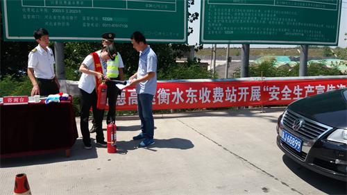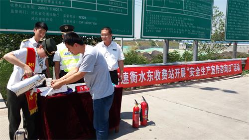 昨天是全國“安全生產宣傳日”,衡水東收費站以高度的社會責任感,積極開展“安全生產宣傳咨詢日”活動。站領導帶領職工在收費站廣場為過往的司乘人員發放《高速公路行車安全常識》、《安全自救辦法》、《消防安全“四個能力”與“四懂四會”》等安全宣傳資料。烈日當頭大家始終堅守在安全宣傳陣地,用心去做安全宣傳工作,認真講解安全知識,并手把手教司乘朋友滅火器的正確使用方法,增強廣大人民群眾的安全防范意識和責任感,切實做到安全無小事,人人需參與。