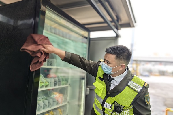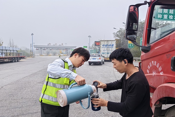 黨員突擊隊主動走到滯留車隊中,逐一安撫,向司乘解釋站口路況,詢問是否需要熱水、修車工具等便民服務。一句句貼心的問候,一杯杯暖心的熱水,在氣溫驟降的深秋,讓“以車為家,以路為伴”的貨車司機心中暖意融融,緩解了他們在等待中的焦慮情緒。隨后,黨員突擊隊認真檢查了外廣場自動販賣機貨品庫存情況,及時補充缺貨商品,確保廣大司機取用方便。