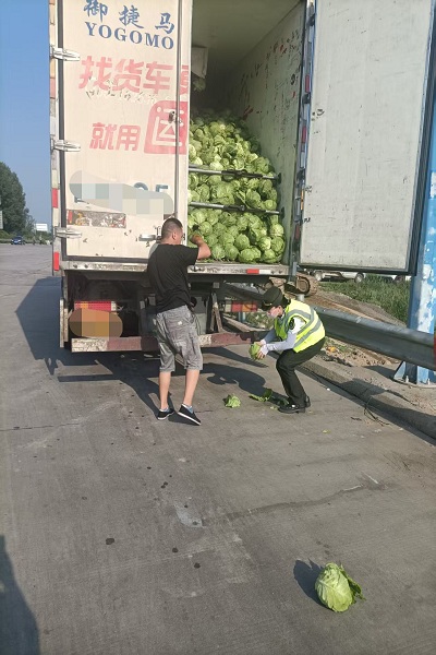 立秋后的清晨依舊有幾分燥熱,兩人蹲在地上將一個個甘藍撿回車內,時不時還安慰司機“沒事,走到咱這了,咱們就幫忙”。短短十幾分鐘,散落的甘藍便被全部整理完畢,車廂也重新碼放整齊。