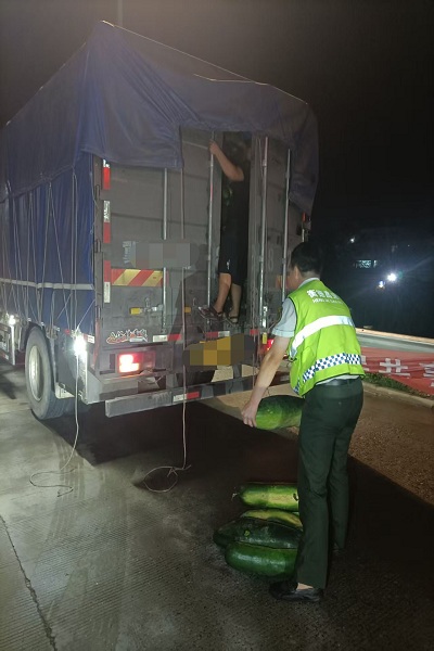 正在旁邊執(zhí)勤的黨員班長于陽聽到聲響,立刻快步上前。他安撫司機(jī)說:“師傅您先別著急,這點(diǎn)事不算啥,我們來幫您!”說完,他轉(zhuǎn)身朝不遠(yuǎn)處的疏導(dǎo)員于麗娜喊道:“娜娜,拿副手套過來,咱們搭把手!”夜色里,他們的身影在燈光下不斷起伏。于陽雙手抱起一個大冬瓜,手臂上的肌肉微微緊繃,穩(wěn)穩(wěn)地將其搬回車廂;于麗娜則細(xì)心地將滾到路邊的冬瓜一個個挪到中間,方便集中搬運(yùn)。兩人默契地配合著,額頭上的汗珠順著臉頰滑落。?