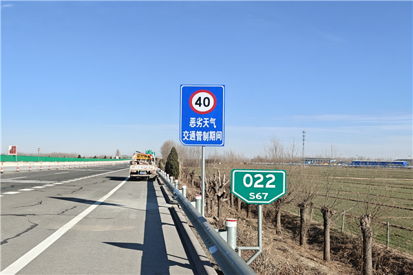 青蘭養(yǎng)護工區(qū)按照規(guī)章要求制作了“惡劣天氣青蘭分流點”“惡劣天氣交通管制期間限速40”“惡劣天氣交通管制期間限速20”“請勿超車”“惡劣天氣靠右出主路”等標志牌。施工人員根據(jù)高速交警提供的位置,嚴格按施工要求依次完成標志牌安裝。