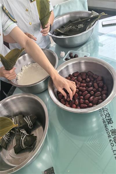 活動現場,經驗豐富的員工手把手教新手折葉、填米、捆繩,大家邊學邊做,歡聲笑語中包出了很多個"愛心粽"。當熱氣騰騰的粽子出鍋時,職工們品嘗著自己的勞動成果,臉上洋溢著幸福的笑容。