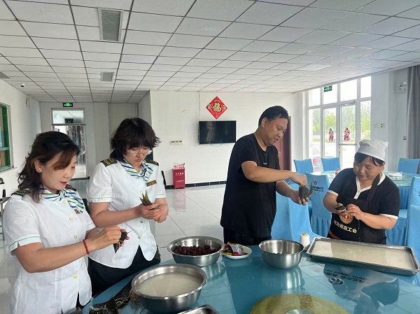 活動開始前,工作人員精心準備了粽葉、糯米、蜜棗、紅棗等豐富的食材,以及包粽子所需的繩子、剪刀等工具。活動開始,職工們紛紛拿起粽葉,開始包粽子,大家互相交流著包粽子的技巧和經驗,有的職工手法嫻熟,包出的粽子有棱有角,像一個個精美的藝術品;有的職工則是新手,包得有些笨拙,但依然興致勃勃,不斷向身邊人請教,現場氣氛熱烈而溫馨。
