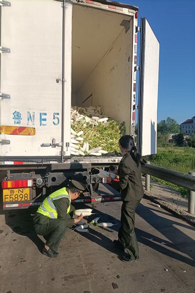 6月4日清晨6時40分,薄霧未散,一輛滿載白蘿卜的貨車緩緩駛入衡水東收費站收費6道。司機報告稱裝載貨物為白蘿卜,收費員按流程示意司機前方靠右停車等待查驗。
