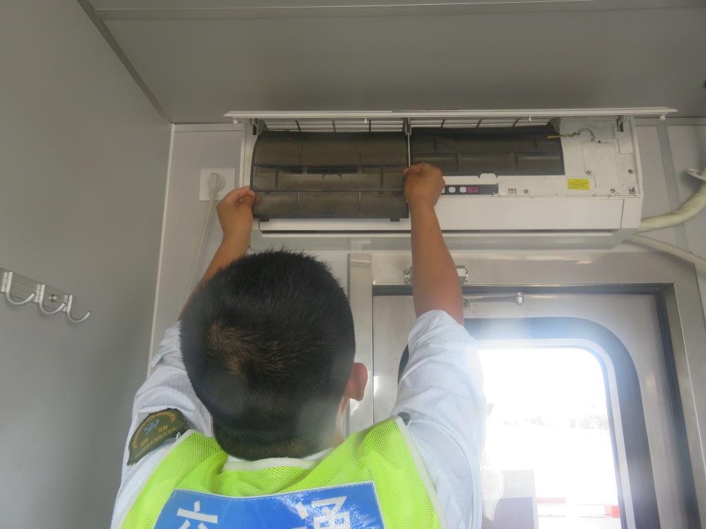 班長與收費(fèi)人員一起對崗?fù)?nèi)空調(diào)設(shè)備逐一進(jìn)行檢查,在檢查過程中發(fā)現(xiàn)空調(diào)機(jī)雖然都能正常運(yùn)轉(zhuǎn),但是機(jī)內(nèi)雜塵和飛蟲特別多,如此多的雜塵不僅危害收費(fèi)人員的健康,也容易耗損機(jī)器壽命。于是班長帶領(lǐng)班組人員依次摘除空調(diào)過濾網(wǎng),同時(shí)再次檢查機(jī)器是否完好,是否存在安全隱患。清洗完后,還貼心的將過濾網(wǎng)擦干再進(jìn)行安裝。
