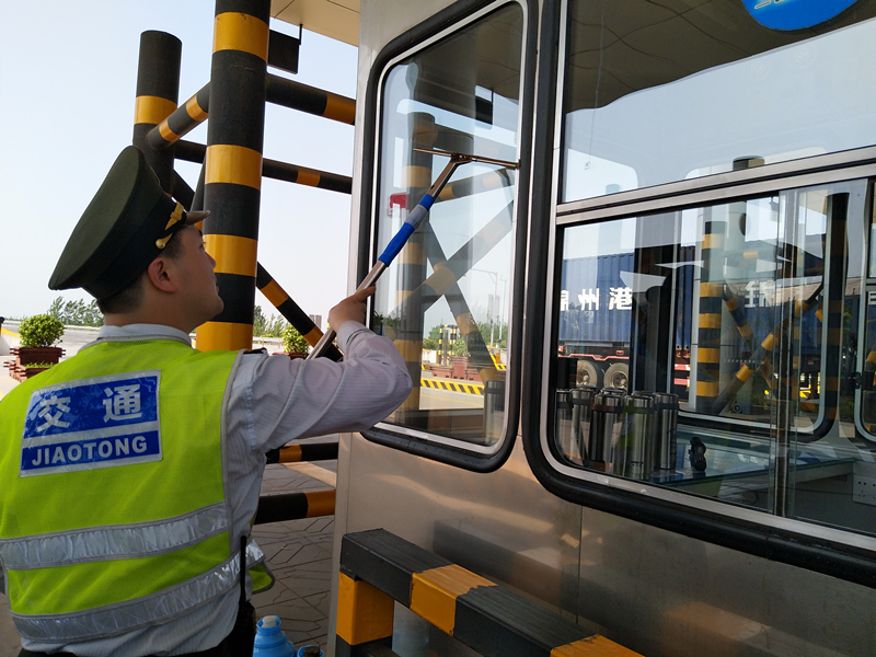 站內職工分工有序,大家有的抬水,有的洗抹布,忙得熱火朝天,不一會兒汗水就浸濕了臉龐,再看大家的勞動成果,一層層透明光亮的玻璃,一條條干凈整潔的車道,讓人感到內心很是舒服,想想那些回家的人們,這樣舒適的行車環境定能讓他們一掃旅途的疲憊,正所謂予人玫瑰,手有余香,在方便司乘的同時也讓一線職工賞心悅目。