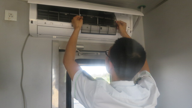 首先,蘇班長帶領班組成員拆下濾網,并擦拭空調表面