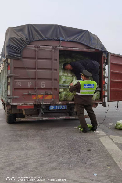 ? ? ? ? 11月28日20時,正值鄭口收費站收費A班當班作業。這時一輛裝載白菜的綠通車輛駛入了108車道,司機要求免費,車輛在查驗區接受查驗時,不料剛一打開車輛后門,好幾袋大白菜掉落到了地上。當班班長陳桂巖快速按規定查驗、拍照,隨后把掉落的白菜一袋袋撿起來遞給司機,由司機重新裝回車上,又幫司機把車廂捆結實后才讓司機離去。