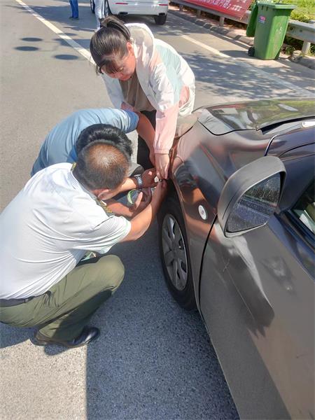 6月23日上午,伴隨著刺啦刺啦的一聲聲異響,一輛京Q車牌的灰色小轎車緩緩駛入鄭口收費105車道。在崗上巡查的值班站長曹夢海急忙上前示意司機停車。原來其左前杠嚴重變形,已至與地面發生摩擦。