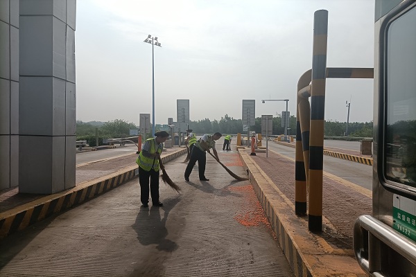 隨后,劉班長迅速組織班里其他人員,緊急開啟備用車道,一邊疏導后方車輛,警示過往車輛減速慢行,避免發生安全事故;一邊迅速清理散落物,經過大家近1小時的共同努力,散落的硬塑料削被清理完畢,車道、廣場瞬間恢復暢通,過往司機連連稱贊。