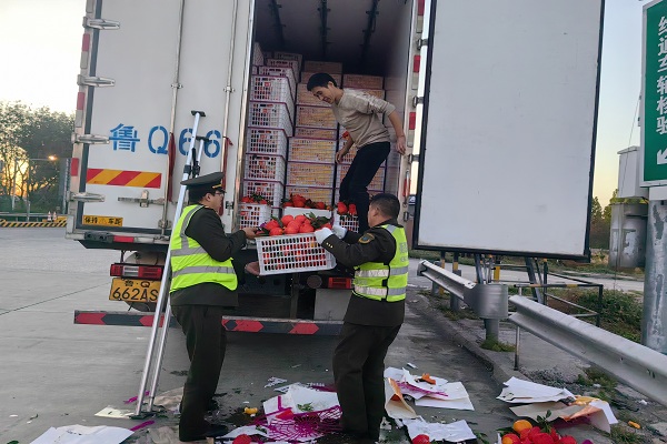 值班站長和疏導(dǎo)員見狀,二話不說趕忙幫司機撿拾散落的橙子。他們一邊利用形狀偏好的貨框加上網(wǎng)格蓋裝載,一邊囑咐司機將傾倒的貨物重新排列。由于掉落的貨物是實心橙子,箱子又重又沉,搬運裝車異常吃力,經(jīng)過一個多小時的努力,滿地散落的貨箱被全部裝上車。看著滿頭大汗的收費人員,司機李先生伸出大拇指,一遍遍地向在場人員稱贊道謝。