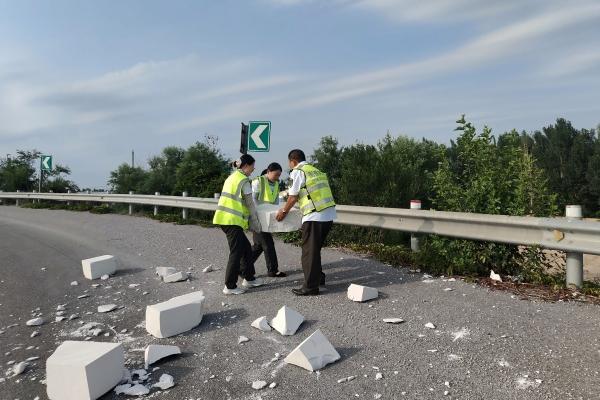 ? ? ? ?收費員周小禹聽聞,立即將情況反映給了值班站長曹夢海。曹夢海第一時間與指揮調(diào)度中心聯(lián)系,通過路上實時監(jiān)控最終鎖定了磚塊掉落的位置。監(jiān)控畫面顯示,匝道內(nèi)側散落著多塊大塊的氣塊磚,還有不少碎裂的碎屑,過往車輛經(jīng)過時都下意識減速避讓。