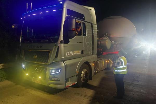 9月初,正值暑假結束、學生返校開學的高峰時段,車流量較大。廟鎮收費站收費D班的疏導員趙愷正在進行疏導作業。突然,他注意到遠處有一輛大型貨車駛來,該車遠光燈等所有燈光全開,顯得異常刺眼。趙愷憑借多年的工作經驗,迅速判斷出這輛車可能存在異常情況,他立即通過無線對講機呼叫班長孫瀏建,請他協助對該車輛進行攔截檢查。