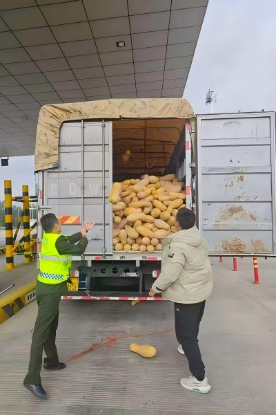 10月21日,鄭口收費站上演了一幕溫暖人心的畫面。一輛滿載南瓜的貨車在驗貨環節,因貨物固定不當,部分南瓜突然散落至收費站廣場,不僅讓司機心急如焚,也對現場通行秩序造成影響。