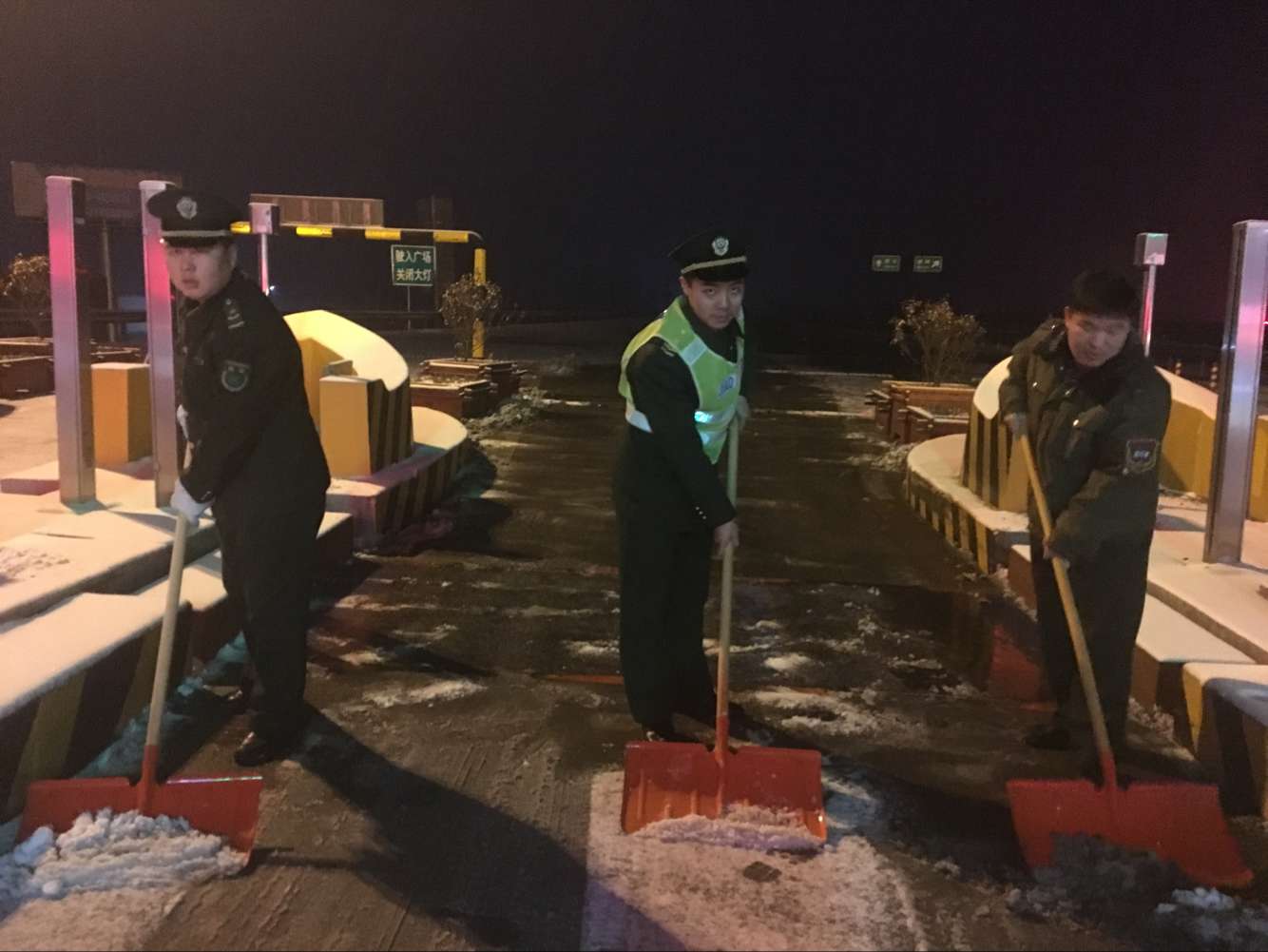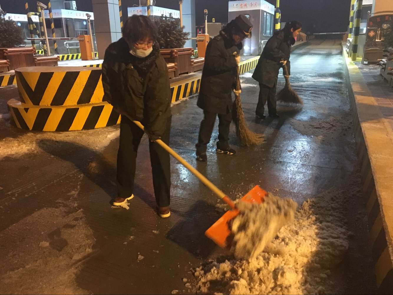 晚21點左右,降雪量漸小,龍華站立即啟動除雪保暢預案,在站長李國起、副站長沈曉東的帶領下,組織后勤人員帶工具上崗,與在崗人員一起清除車道及廣場積雪。大家不懼嚴寒,分工協作,有序開展除雪保暢任務。女同志拿起掃帚清掃島頭積雪,男同志用鐵鍬和推車迅速將車道積雪運走,除雪活動歷時2小時20分鐘,7個收費島、8條收費車道全部清掃干凈,南北2個收費廣場的部分積雪也清除完畢。由于此次除雪時間緊、任務重,整個除雪過程連續進行,雪花落到身上也都顧不得拍打,大家衣領里、褲腳里灌滿了雪,臉上已分不清是汗水還是雪水,手冷了就用嘴哈哈氣、腳冷了就用力跺跺腳,雖然辛苦但沒有一個人叫苦叫累,無論是年滿50歲面臨退休的蘇大姐還是剛剛參加工作不久的新人,無論是站領導還是普通職工,大家心中都只有一個信念,那就是團結一心高標準完成急難險重任務,用積極的工作態度和滿腔的工作熱情回報組織、服務司乘。![]()