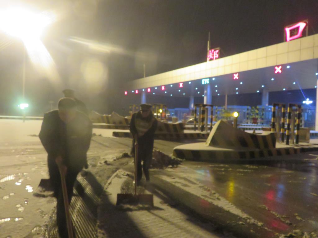 在站長的帶領下,大家拿著鐵鍬、掃帚等工具來到了收費廣場,不顧刺骨的寒風、不顧一天的疲憊,全力清除著車道、廣場內的積雪,大家團結協作、全力奮戰,經過三個多小時的努力,終于將收費廣場及車道、島頭的積雪清理干凈。