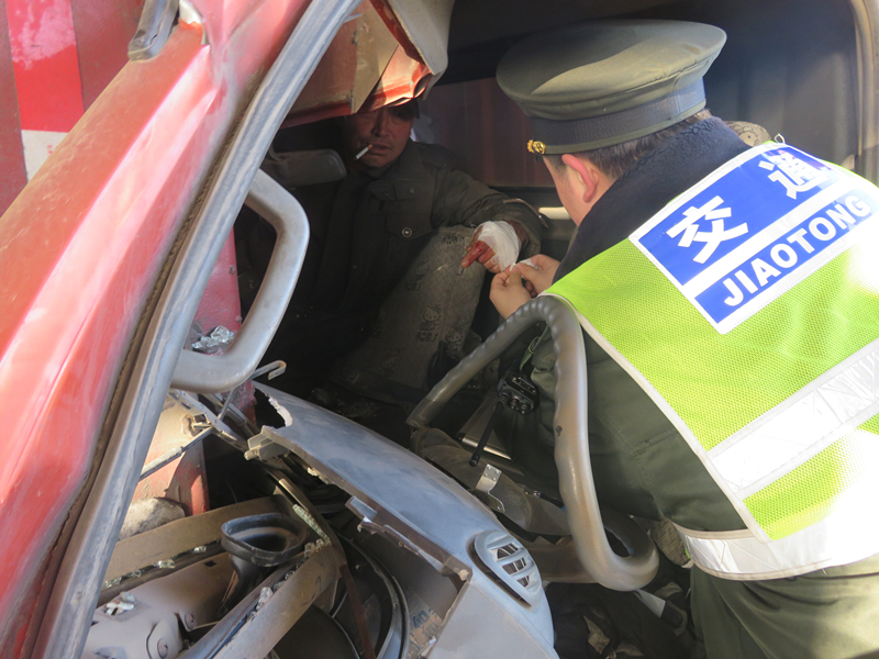 事故發生后,當班班長謝金樹立即開啟備用車道,上報值班站長和指調中心并觀察現場情況,發現后車駕駛室變形嚴重,所幸司機與乘客二人并無大礙,值班站長田洪健立即組織當班人員對其施救,在幫助司機脫離駕駛室后,該車副駕乘客的腿被變形的駕駛室卡住無法抽出,由于擔心對該乘客在施救過程中造成二次傷害,值班站長田洪健當即撥打“119”報警電話。在等待救援的過程中,班長謝金樹使用創可貼、繃帶等對車內乘客劃傷部位進行簡易包扎。待消防隊到達之后,當班人員協助他們成功解救出被困乘客。將事故車輛拖離車道后,班長及疏導人員對車道進行清理,保障車道正常使用。