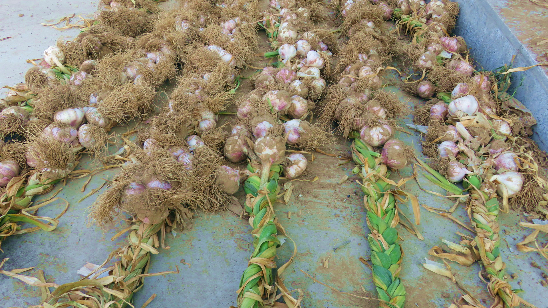 大蒜收獲后,大家和食堂師傅一起對(duì)準(zhǔn)備掛藏的大蒜進(jìn)行嚴(yán)格挑選,去除那些過(guò)小、莖葉腐爛、受損傷和受潮的蒜頭。經(jīng)過(guò)一天的晾曬,大蒜葉的水分基本蒸發(fā),外皮已干。6月1日趁著涼爽的清晨,在大家的巧手下,雜亂零散的大蒜變成溫順的綿羊,散亂的大蒜變得整齊有序,像經(jīng)過(guò)訓(xùn)練的士兵,整齊的排在一起。編好的大蒜掛在二樓露臺(tái)上,便于風(fēng)干貯存,這樣既節(jié)省了食堂開(kāi)支,又能用到放心的調(diào)料,這就是對(duì)全體職工勞動(dòng)的最好的回報(bào)。