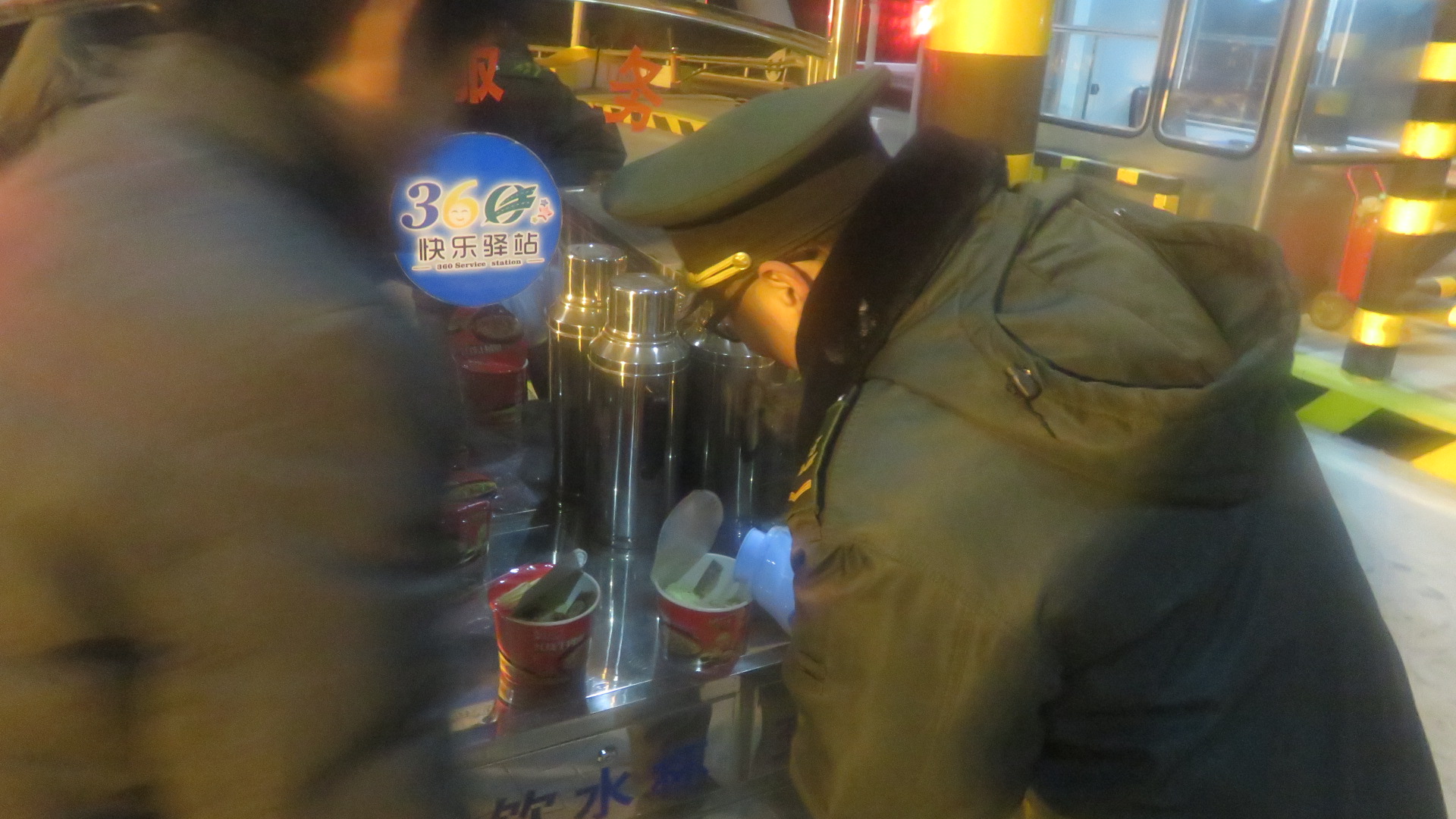 一個個綠色的制服在大霧中跳躍著。他們一方面積極開展安全隱患排查工作,在值班領導的帶領下,對站內的所有安全設施進行檢查,確保大霧天氣下,各項設備的正常運轉,為開道后的安全保暢保駕護航;另一方面,他們盡己所能為司機提供幫助,一壺壺熱水,溫暖了司機們的心,一桶桶泡面,安穩了司機們的胃,利用站內的衛生間為司乘們提供方面,經歷了一晚上的煎熬,能洗個熱水臉對司乘們來說是在好不過的選擇。