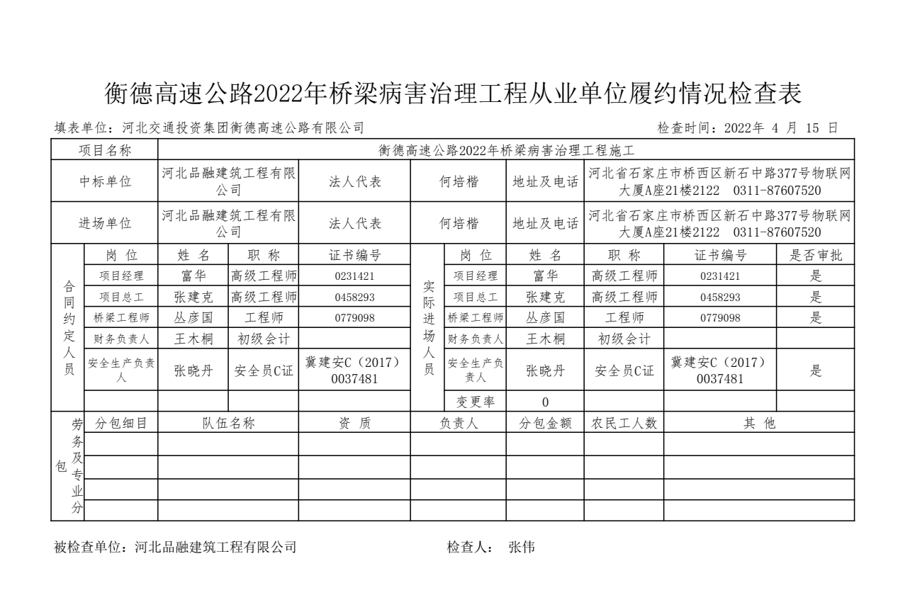 衡德高速公路2022年橋梁病害治理工程從業(yè)單位履約情況