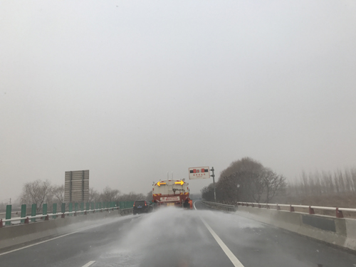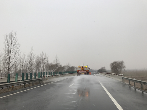 12月14日早晨,雪花飄落,工區全體立即整裝待發,在衡德高速及故城支線沿線橋梁、彎道、匝道等重要部位撒布液態融雪劑,經過緊張的撒布作業,路面無積雪積冰情況。