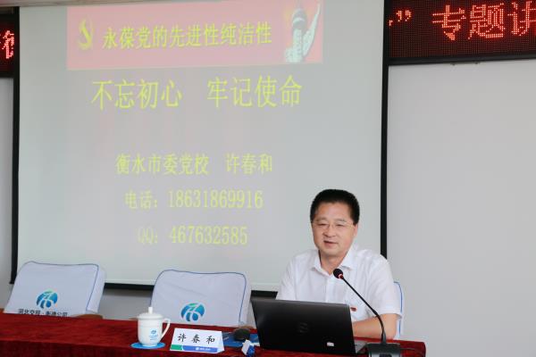 講座邀請了衡水市委黨校黨建研究室主任許春和教授作專題輔導。許春和以“不忘初心、牢記使命”為題,從“什么是中國共產黨人的初心和使命”“為什么要重視初心和使命”“新時代怎樣做到‘不忘初心、牢記使命’”3個方面做了詳細解讀。講座內容豐富、觀點鮮明,意義深遠、鼓舞人心,語言形象生動,案例旁征博引,加深了大家對“不忘初心、牢記使命”主題教育重大意義的認識和領會,為公司扎實開展好主題教育提供了充足的精神食糧。