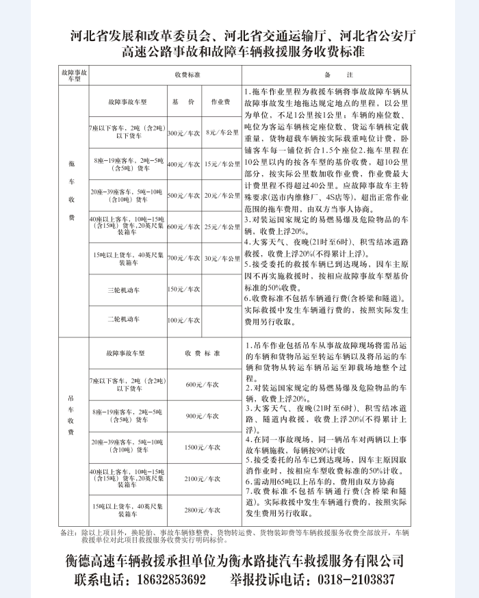 衡德公司車輛救援服務收費標準、救援服務單位及救援服務聯系方式
