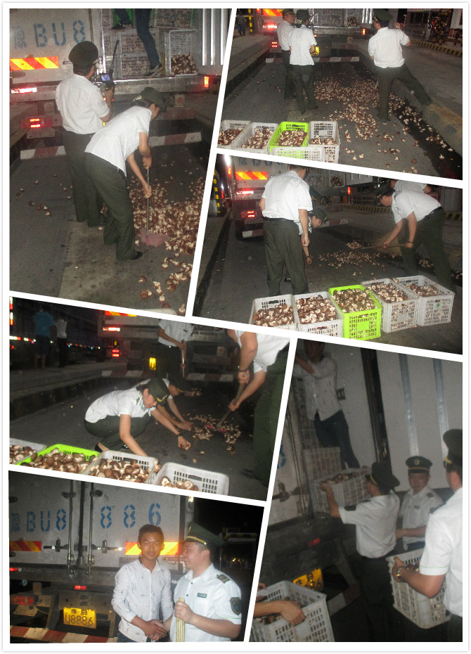 7月13日夜間,一輛車牌號為豫BU8886的貨車駛入景州主線收費站114道,司機下車配合收費員進行綠通檢測。當走到車尾處,司機打開車箱門,裝載在車箱里的香菇從里邊散落下來。見到此狀況D班班長李健立即上前幫助,并安排人員疏導車輛保證收費工作正常運行。在金愛劍、張冀魯、劉冰、宋夢落共同努力下,用最短的時間將散落在車道里的香菇清掃干凈,并幫助司機將香菇裝載上車。司機師傅感激的說:“要不是你們的幫忙,我一個人手里沒有工具得且弄一會兒,而且還要耽誤送貨的時間,真是太謝謝你們了!”班長李健連忙說:“沒事,這是我們應該做的。”