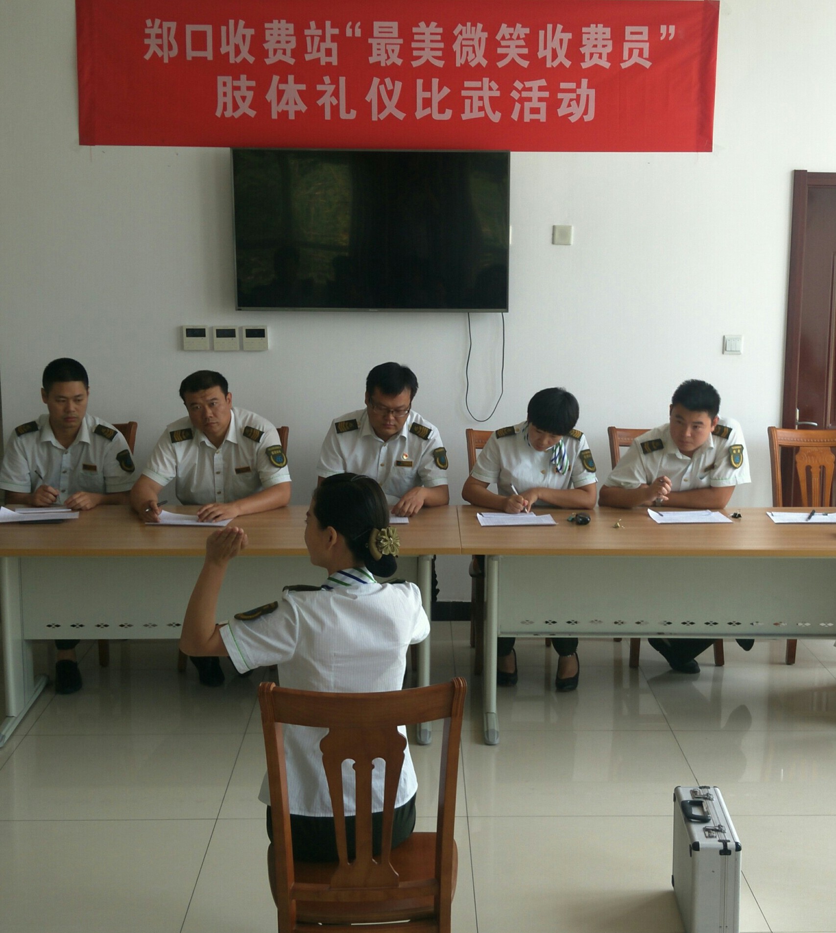 為充分調動收費人員的工作積極性,切實提高收費人員專業技能水平和職業素養,打造良好窗口形象,7月6日上午,衡德公司鄭口收費站黨支部組織開展了“最美微笑收費員”肢體禮儀比武,共16名收費人員參加了此次比賽。