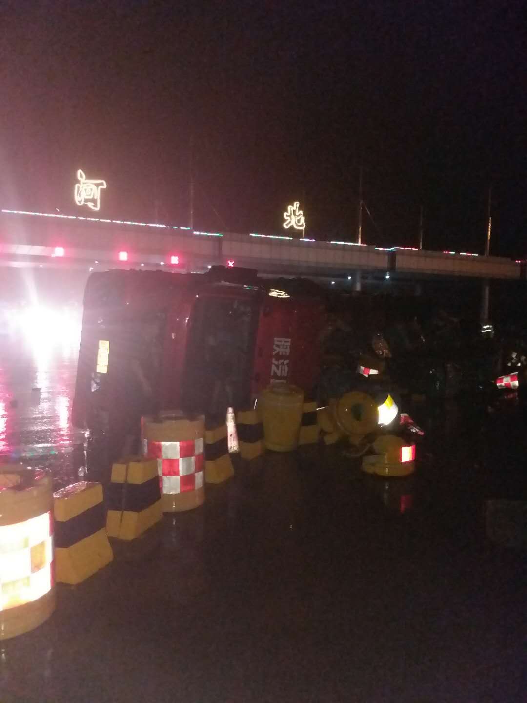 7月13日,大雨隆隆的下著,晚上十一點左右一輛滿載貨物的貨車在通過衡德高速景州主線收費站時,因路面濕滑剎車失靈,自ETC車道闖桿,司機在躲避前方高速警示墩時,發生側翻。