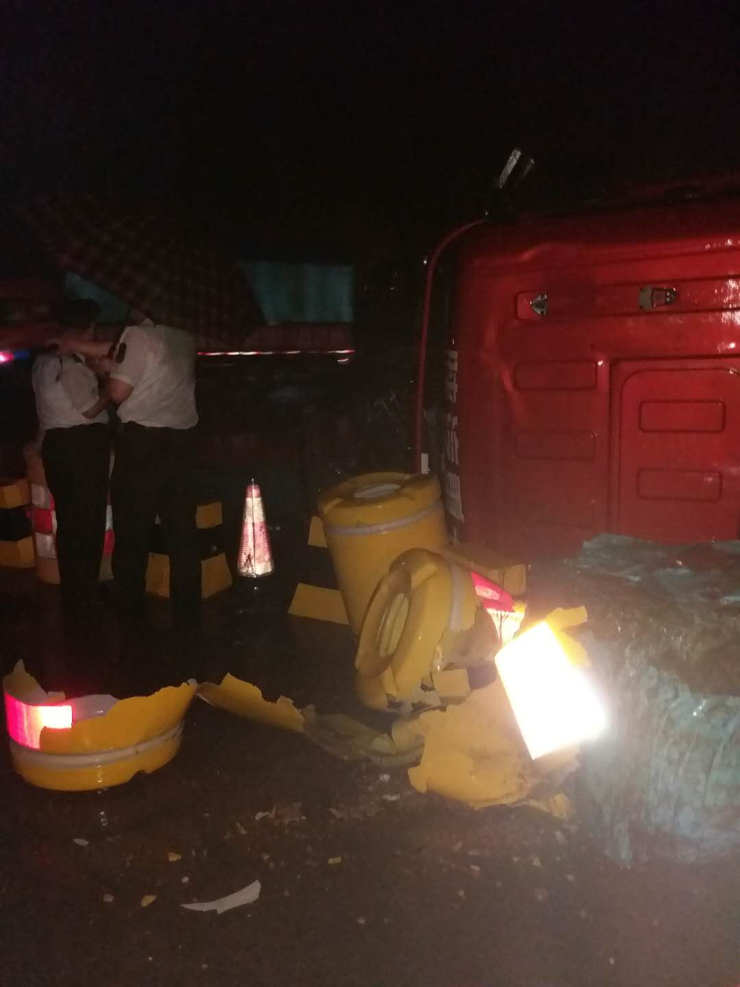 發生事故后,班長馮斌立即通知值班站長。第一時間帶領外勤王向、高彬、黑玉才立即趕往現場,展開營救。經過初步勘察,發現側翻貨車油箱已漏油,貨車的車頭已經嚴重變形,兩個貨車司機被困駕駛室且有一人輕傷。情況緊急,馮班長等人立即展開營救,幫司機打碎車窗,成功解救司乘人員。此時,側翻貨車貨物灑落一地,馮班長立即讓外勤人員疏導車輛,在事故現場周圍擺放警示標志,避免發生二次交通事故。
