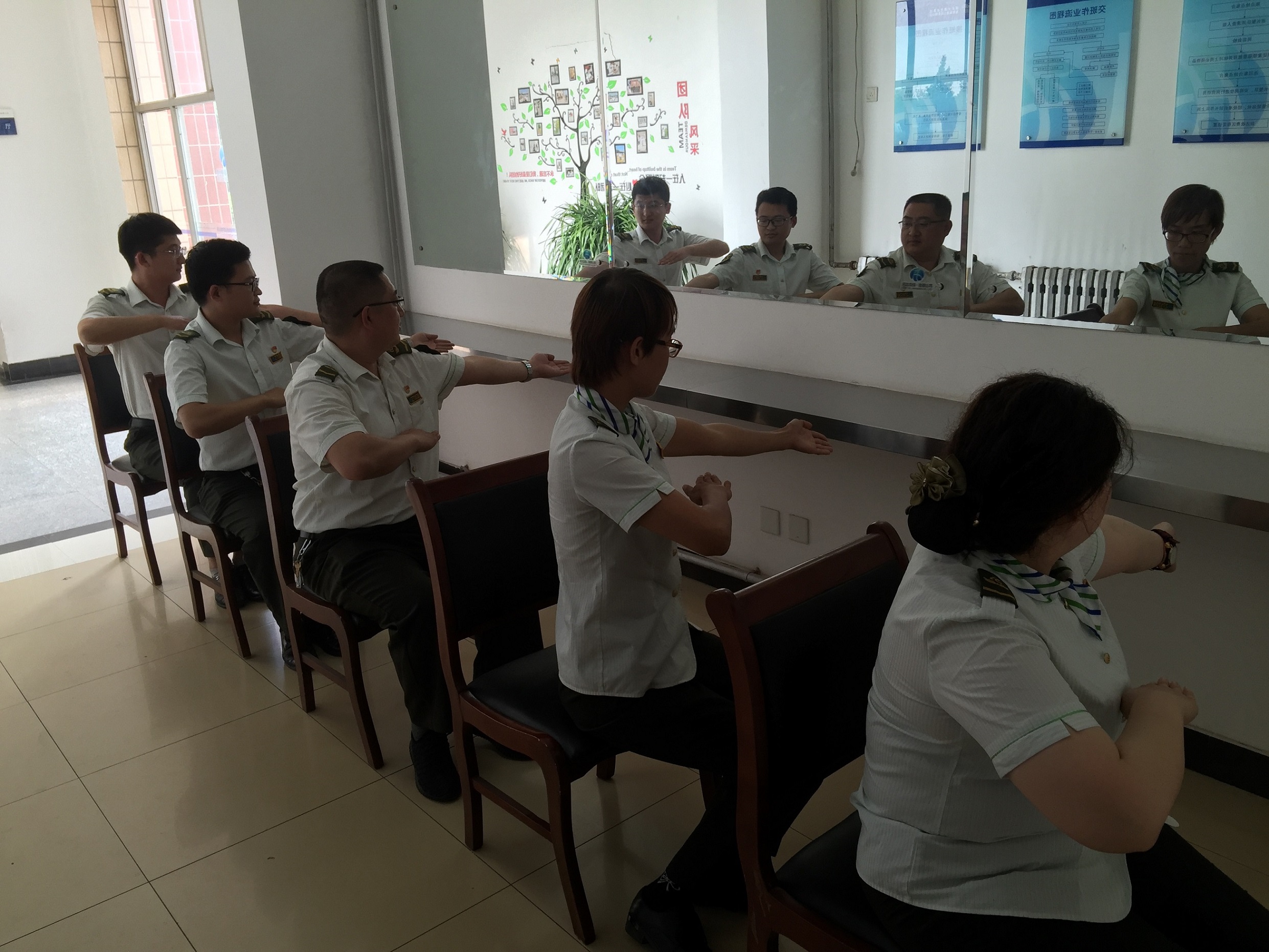 班長柳嘉誠帶領本班人員通過參照肢體語言標準,指導本班人員反復練習。黨員許慶軍同志也積極給大家講解每個動作需要注意的事項,一對一給大家糾正不足,力求大家把每一個手勢,每一次轉體,每一次點頭微笑做到最好。