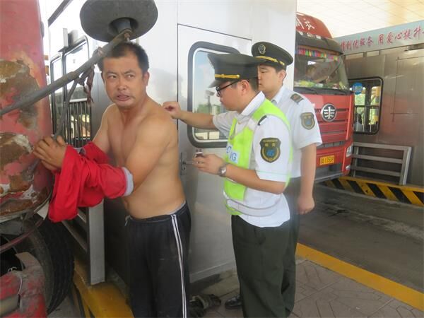6月8日9時,一輛滿載貨物的大貨車行駛至105車道,在進行正常繳費后由于發動機故障停在了車道內。班長劉楊和疏導張鈺朋得知情況后立即上前協助,焦急萬分的司機慌忙鉆到車底進行檢查,身上沾滿了油污,一個不小心后背被劃傷了一道口子。考慮到司機的傷口如果不及時處理會有感染的風險,班長劉楊勸說司機馬上從車底出來,并親自去便民服務臺取來了醫藥箱。經過了清洗、消毒、包扎等過程,司機的傷口得到了妥善的處置。