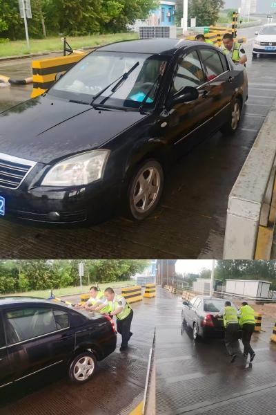 ? ? ??收費員杜佳第一時間發(fā)現了這一情況,他迅速報告給班長柳嘉誠,并快步跑到故障車輛旁。只見司機滿臉焦急,嘗試多次打火,車輛卻毫無反應。為了盡快恢復車道暢通,避免擁堵加劇,他們二人合力將車推至安全區(qū)域,杜佳又在車輛周圍放置了反光錐,提醒過往車輛注意安全。