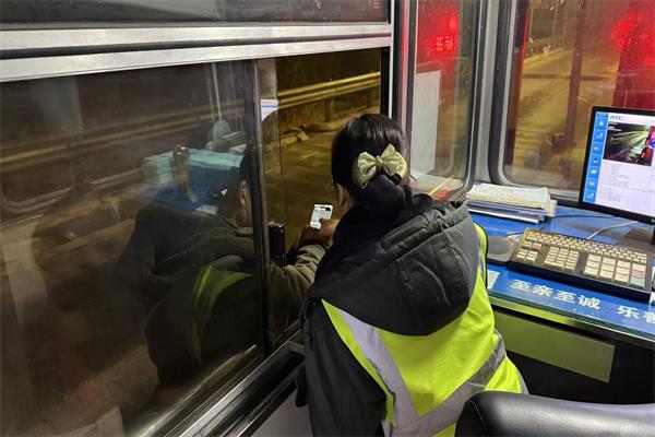 師傅年紀大了,對電子設備的操作理解得慢,一個簡單的步驟往往要重復好幾遍。宋夢落始終面帶耐心,既沒有因后方車輛排隊而催促,也沒有因講解繁瑣而懈怠,反而主動走出崗亭,湊近車窗手把手指導,直到師傅能清晰看懂導航界面上的路線指引。二十分鐘的時間,在車水馬龍的收費站里顯得格外漫長,卻也讓這位貨車司機徹底放下了心中的焦慮。臨行前,師傅握著宋夢落的手連聲道謝,夜色里,那句“姑娘,太謝謝你了”,成了對這份貼心服務最樸實的認可。