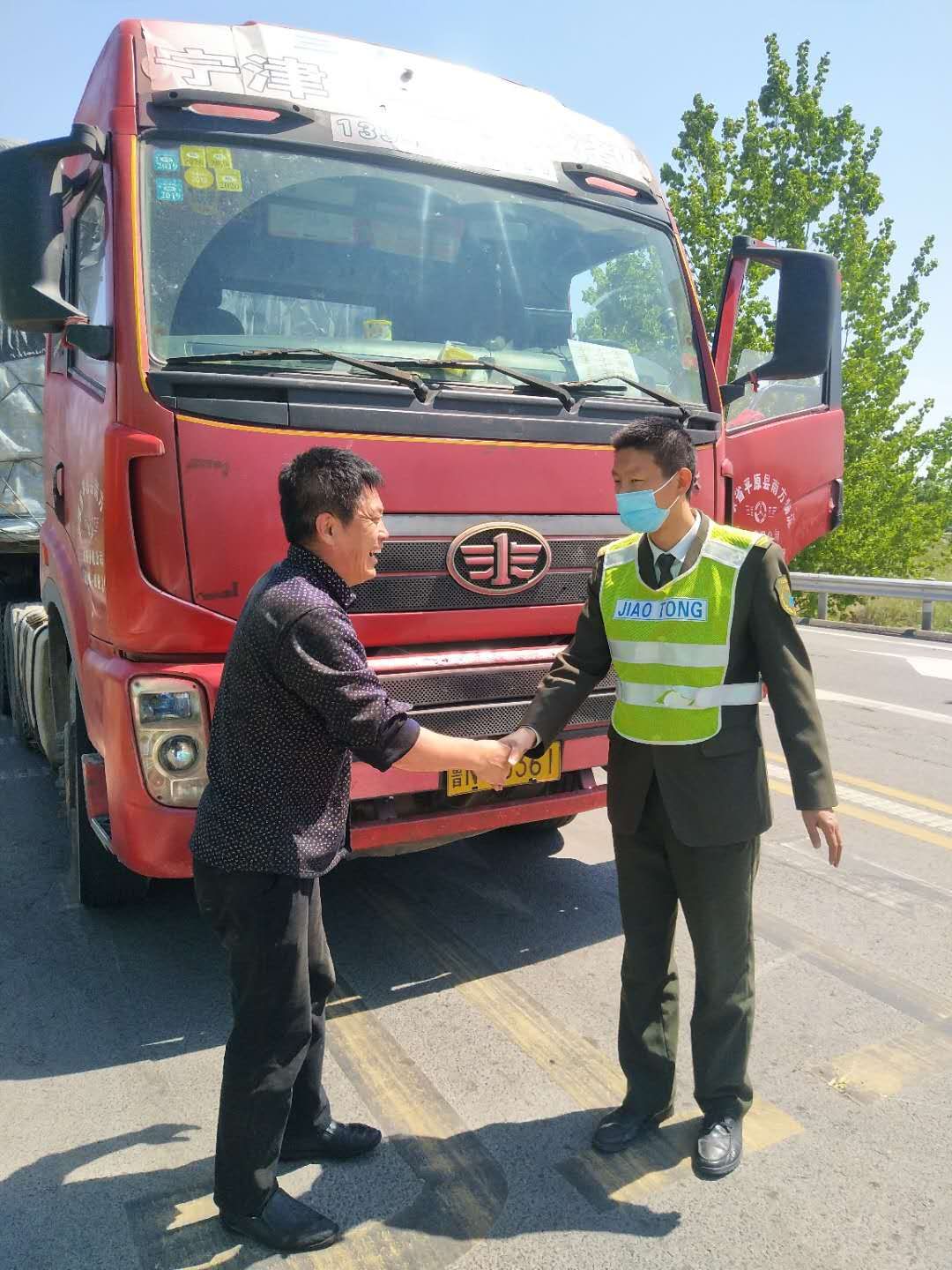 ? ? ? ?突然車流斷開,一時間車輛鳴笛不止,當班副站長房磊和疏導人員陳龍第一時間趕上前了解情況,一輛貨車停在車道中間。經詢問得知,原來貨車的轉向軸脫落,無法前行。事發緊急,房磊當機立斷,先在貨車后方擺放安全錐桶,指揮后面的車輛繞行,隨后找來修車工具幫助司機修車。經過將近20分鐘的修理,車終于修好了。臨行前,司機拉著房磊的手連連道謝,房磊也一再囑咐司機出行前一定要檢查好車況。