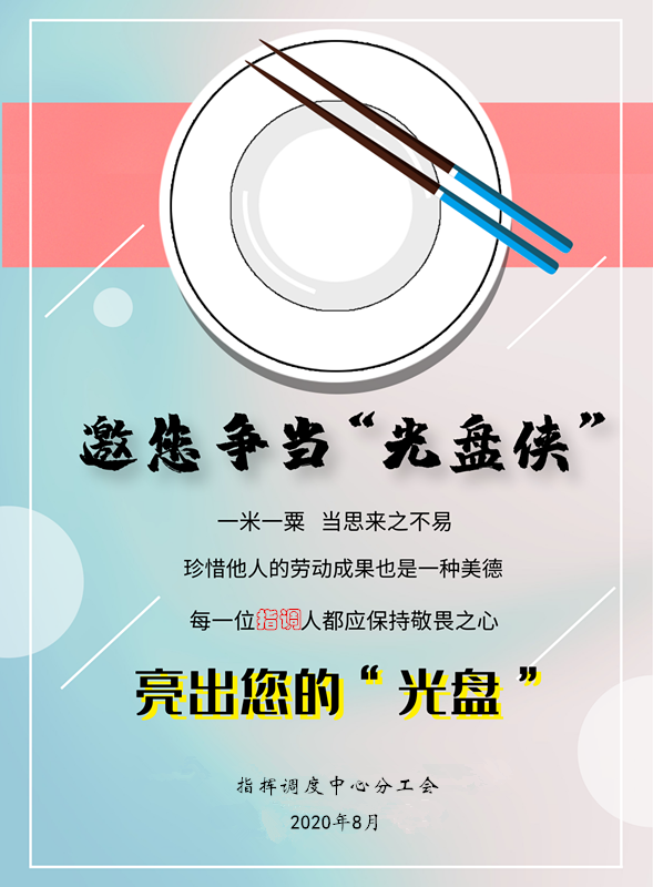 近日,指揮調度中心組織開展文明用餐、爭當“光盤俠”活動,以實際行動貫徹落實習近平總書記關于厲行節約、反對浪費重要批示精神,營造浪費可恥、節約為榮的良好氛圍。