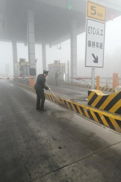 2020年12月11日,由于大霧交通管制,廟鎮收費站南口處于封閉狀態。上午8點,廟鎮收費站收費B班剛剛接班,班組成員閑里偷忙,自覺的組織打掃廣場滯留車輛丟棄的垃圾。