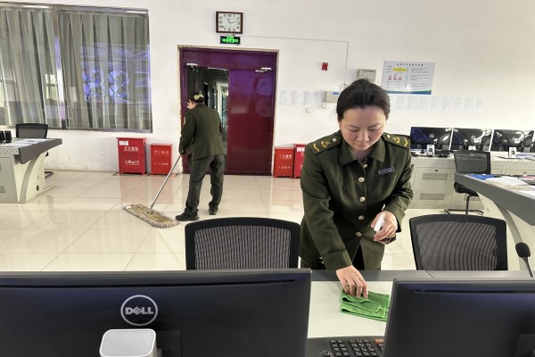 二是以實際行動營造良好辦公環境。中心人員兩人為一組,劃分衛生區,通過清理監控室衛生死角、擦拭監控室電腦、桌椅、門窗玻璃,保證做到墻面整潔無塵,規律有序擺放物品,電源開關、座椅扶手無污垢。