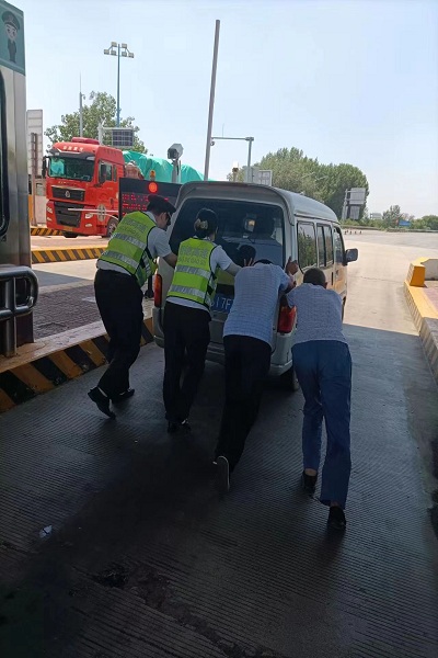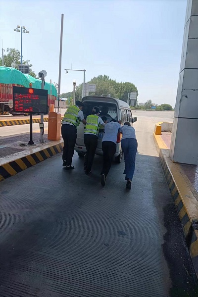 該車司機多次嘗試打火仍無法啟動車輛,收費人員立即幫助該司乘一起將車輛推至收費外廣場安全區域,并擺放錐桶做好安全防護。司機十分感謝衡水東收費站工作人員在炎炎夏日的熱心幫助。