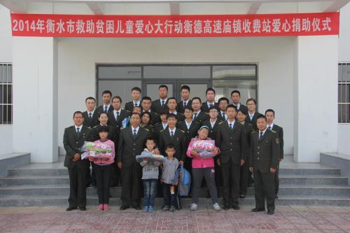 10月25日,在衡德高速廟鎮收費站隆重舉行2014衡水市救助貧困兒童愛心大行動,開展愛心捐助儀式。衡德高速公路分公司黨總支書記郭志戰和高速巡警景州大隊李峻衡教導員以及廟鎮站的全體職工們出席了這次的捐贈儀式。