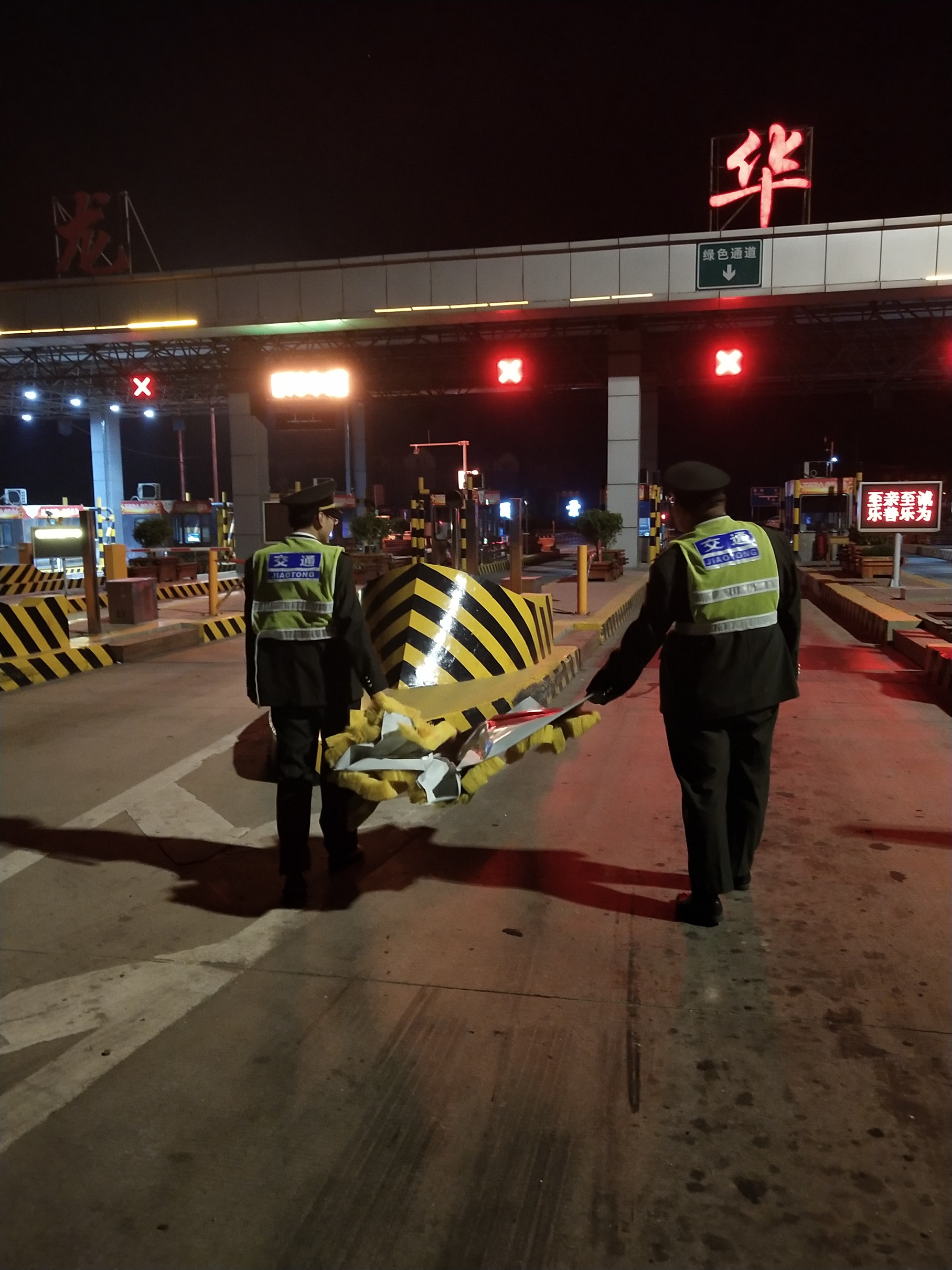 安全員楊昭在夜班執勤時發現龍華收費站收費北廣場有大塊鐵皮異物,快速召集外勤崔英喆,共同把鐵皮搬至島頭安全處,保障了司乘夜間行車安全。