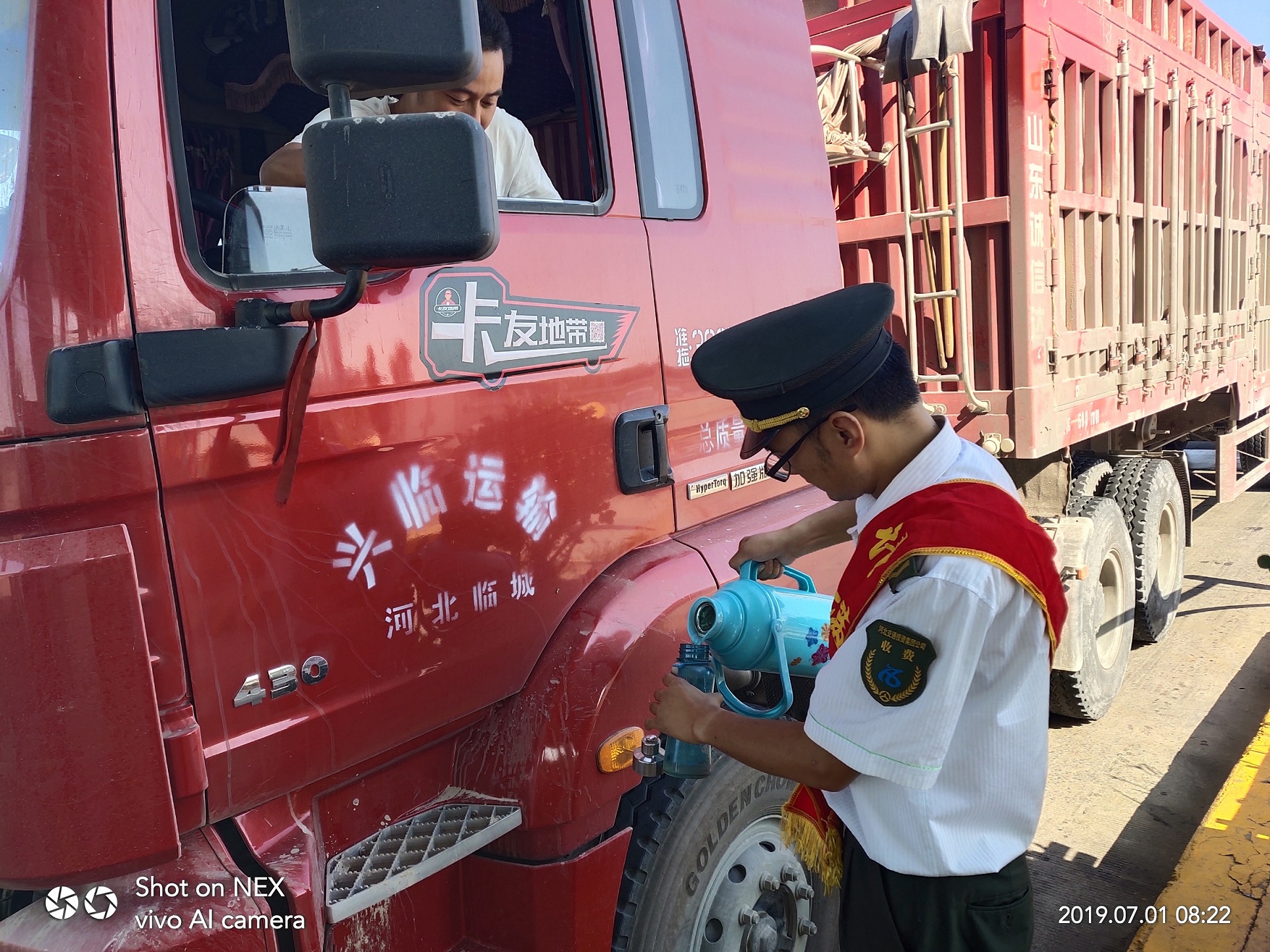 活動中,班組人員和司乘們近距離接觸,以黨員蘇勁超、班組成員楊昭作為優秀代表,為過往司乘倒滿了水,與他們閑話家常,了解他們的需求,為他們提供更好的服務,司乘也為他們豎起了大拇指。