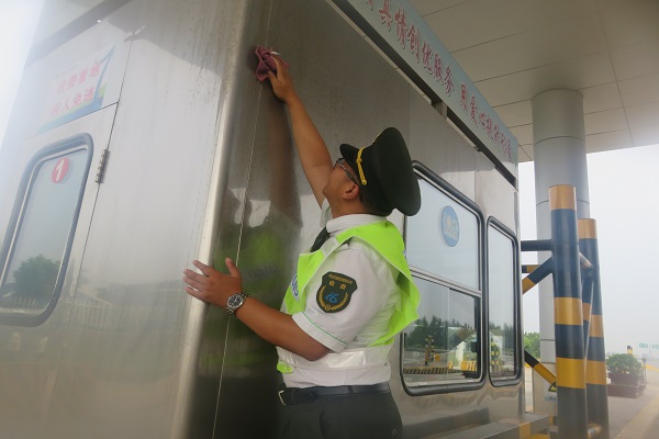 斷斷續續的幾次降雨并沒有帶來天氣的涼爽舒適,反而讓青蘭收費站廣場上的標志標牌蒙上一層塵土和水印。德遠班的成員發現這一問題后,迅速組織安排進行清理。