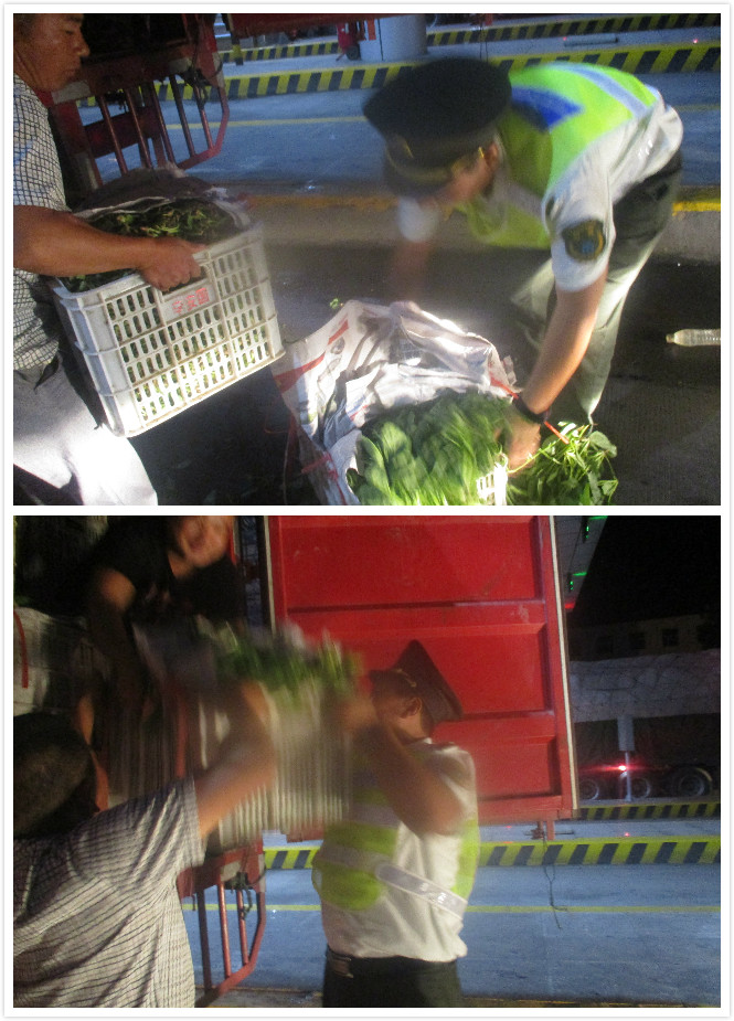 93號晚上十一點左右,景州主線收費站收費D班正像平時一樣進行忙碌但有序的工作,這個時間的綠通車輛很多,一輛接一輛。當我對一輛來自東洋河運送蔬菜的貨車進行檢驗時,從車頭走向車尾的過程中發現車道里散落了一地的菠菜,司機說可能是路途太遠在運送過程中箱子晃動導致一開車門菜筐掉下來了,這時我們班組的疏導員陳思尚二話不說就幫司機抬筐撿菜,司機一直道謝,陳思尚說:“這是我們應該做的,不用客氣”。