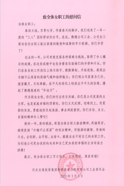 一是寫一封慰問信。為了表達對女職工的慰問和關心,衡德公司工會委員會以“慰問信”的形式向全體女職工致以節日的問候和充分的感謝,高度肯定了過去一年里女職工在各自的工作崗位上恪盡職守、默默耕耘、開拓進取,展現出巾幗不讓須眉的英雄氣概和獨特魅力,在平凡的崗位上創造出不平凡的佳績,期望在新的一年里,女職工們再接再厲,再現佳績,不斷在工作中綻放光芒。