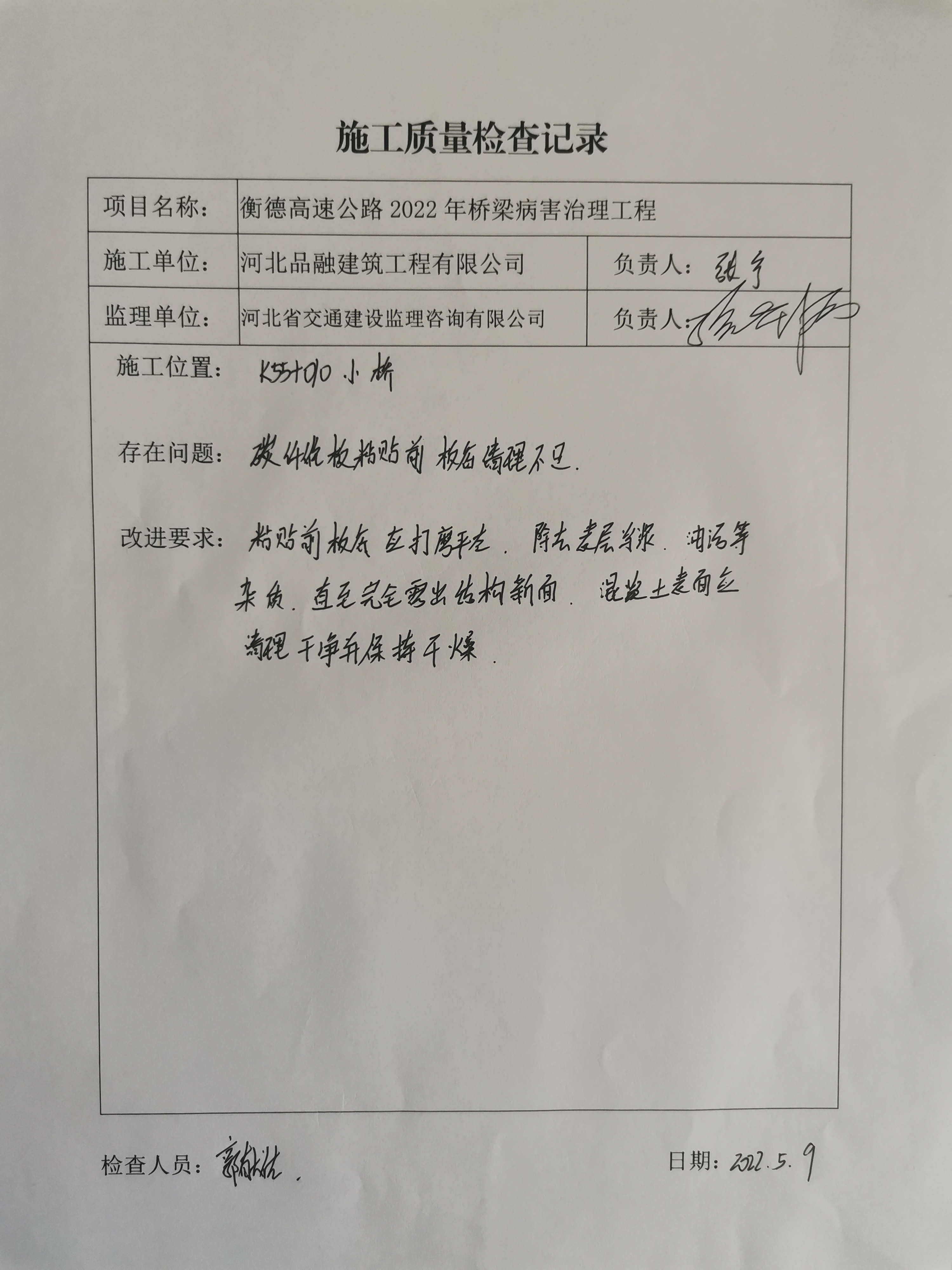 衡德高速公路2022年橋梁病害治理工程質(zhì)量檢查